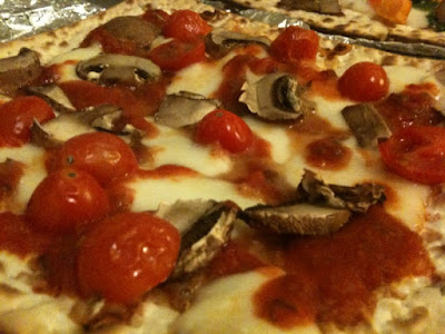 I made two pies, each of which I started off with some chunks of mozzarella (I used Trader Joe’s Fresh Mozzarella Medallions). On pie number one I added some tomatoes and mushrooms, topping the pie off with some scoops of tomato sauce. On pie number two, I added some mushrooms, some orange peppers, and some spinach leaves.