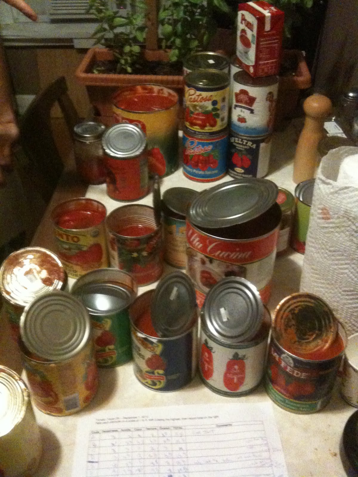 It was definitely the most intense tomato experience I’ve ever had. We did a blind taste test of 16 canned tomatoes (and there were another dozen we didn’t make it to)! We rated the tomatoes on sweetness, color, texture and acidity, among other characteristics.