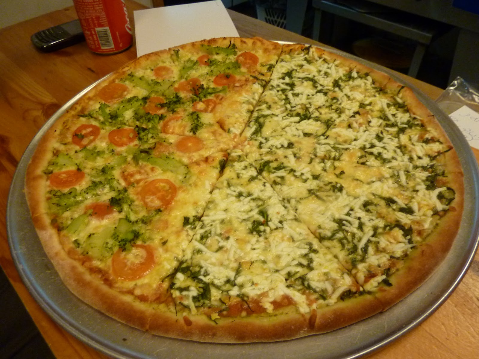 The pizza place serves a variety of slices and you can also order a full pie, as we did. During the hour we spent there, I don’t recall any ordering a Margherita pie or slices. The shop is apparently known for some of it’s more creative concoctions. The pie that we ordered contained two halves: one with broccoli and tomato and the other with spinach and a Hungarian like cheese that resembles feta. By the looks of the pies that were coming out, my expectations had been lowered. The toppings appeared to be uninspiring, and to be honest, the pies just didn’t look that tasty. The dough was being flatted with a rolling pin and the crust looked like it cooked poorly in the pizzeria’s oven.