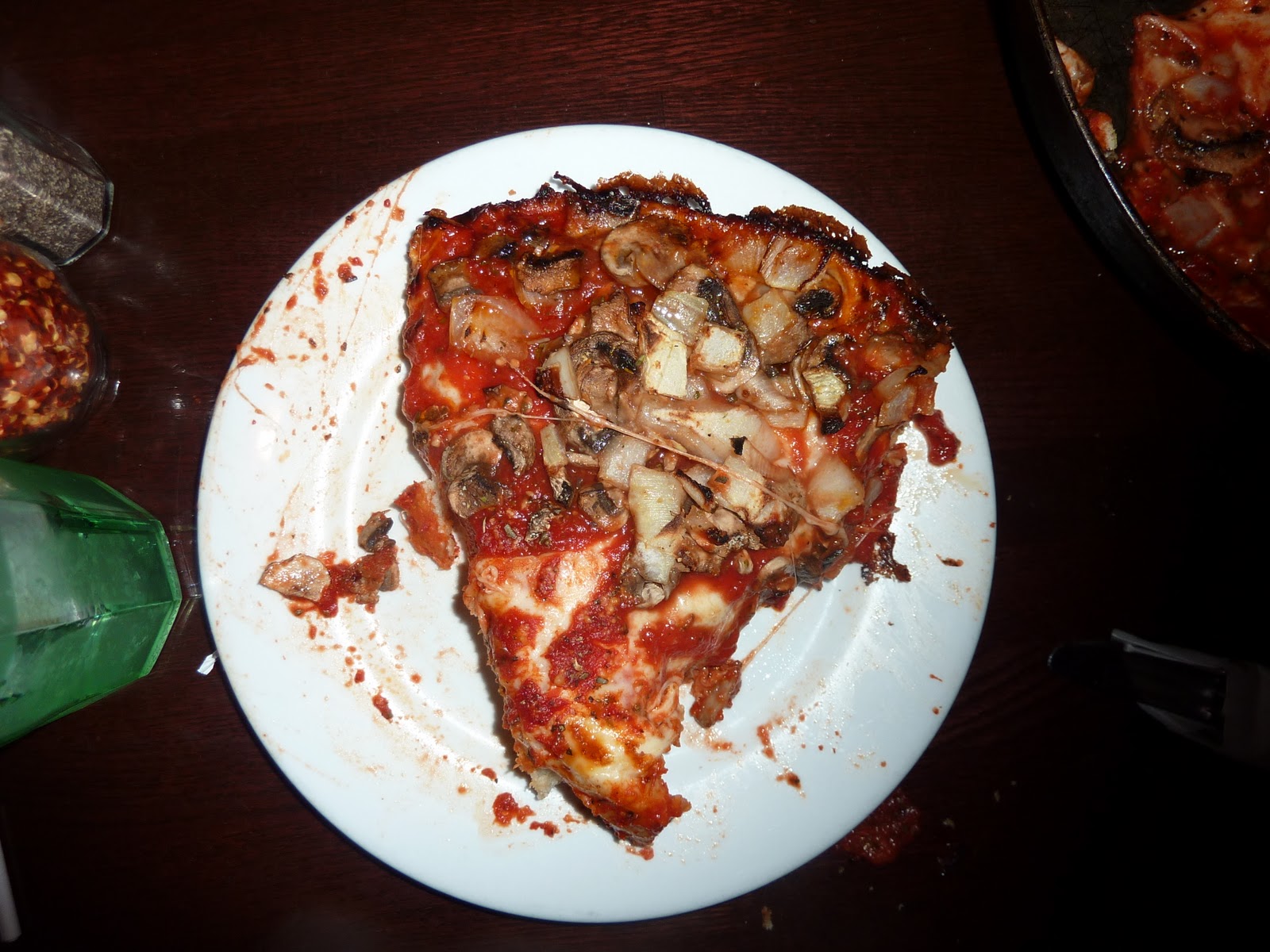 The pizza at Pequod’s is… well… filling. So filling that you almost feel disgusted by every bite you take. But isn’t that what deep dish pizza is suppose to do to you? My friend and I ordered one medium pan pizza, half with mushrooms and onions ($15.95). It would have been enough for a least one other person. There was so much cheese on the pie, it was difficult to distinguish between slices. It felt as if I was digging a spatula into the pan and grabbing whatever part of the pie came up.