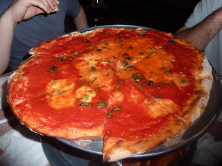 As our reservation was for 9:00PM — the last party to be seated — the woman working there was eager to take our order. She told us that we needed to place our order quickly because the oven was cooling down. Although the pressure was on, we were able to agree on five pies: Mushroom & Onion, Sausage, Spinach & Tomato, Tomato & Basil, and Margherita.