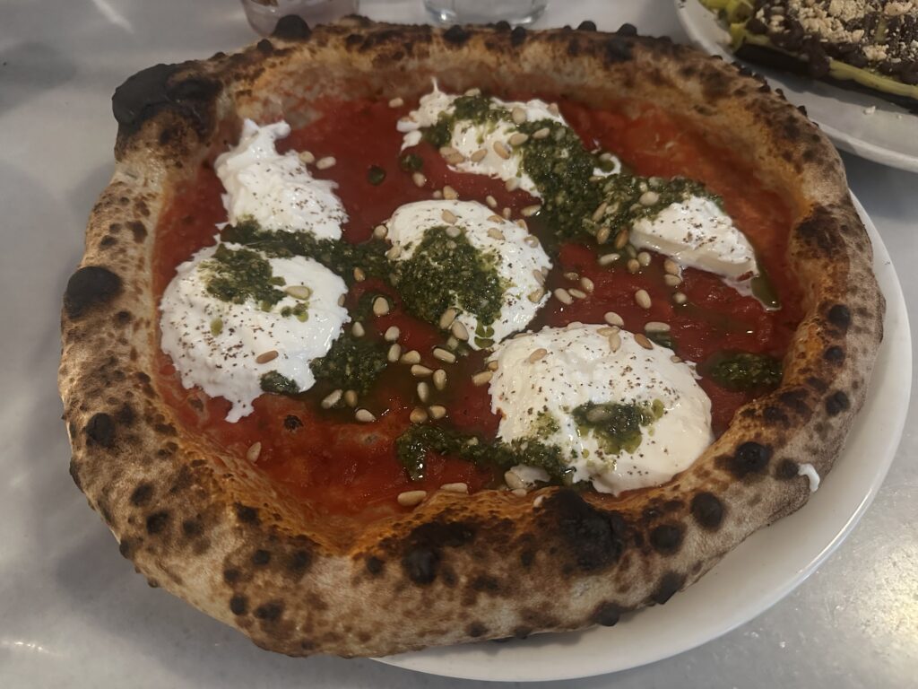 We ordered two pies: a burrata, tomato and pesto pie from the “Classics” section and a pie from the seasonal section featuring: applesauce, Blau Cereta cheese, sweet and sour celery, caramelized almonds, mozzarella, and freeze dried apples. I mean… how fun is that combination? And the best part is that the freeze dried apples are served on the side — you need to crush them on the pie yourself. I love an interactive food experience (as did my 6 year old). The pies were unique, delicious, and photogenic. They were extremely thin and — dare I say — really required utensils to eat.
